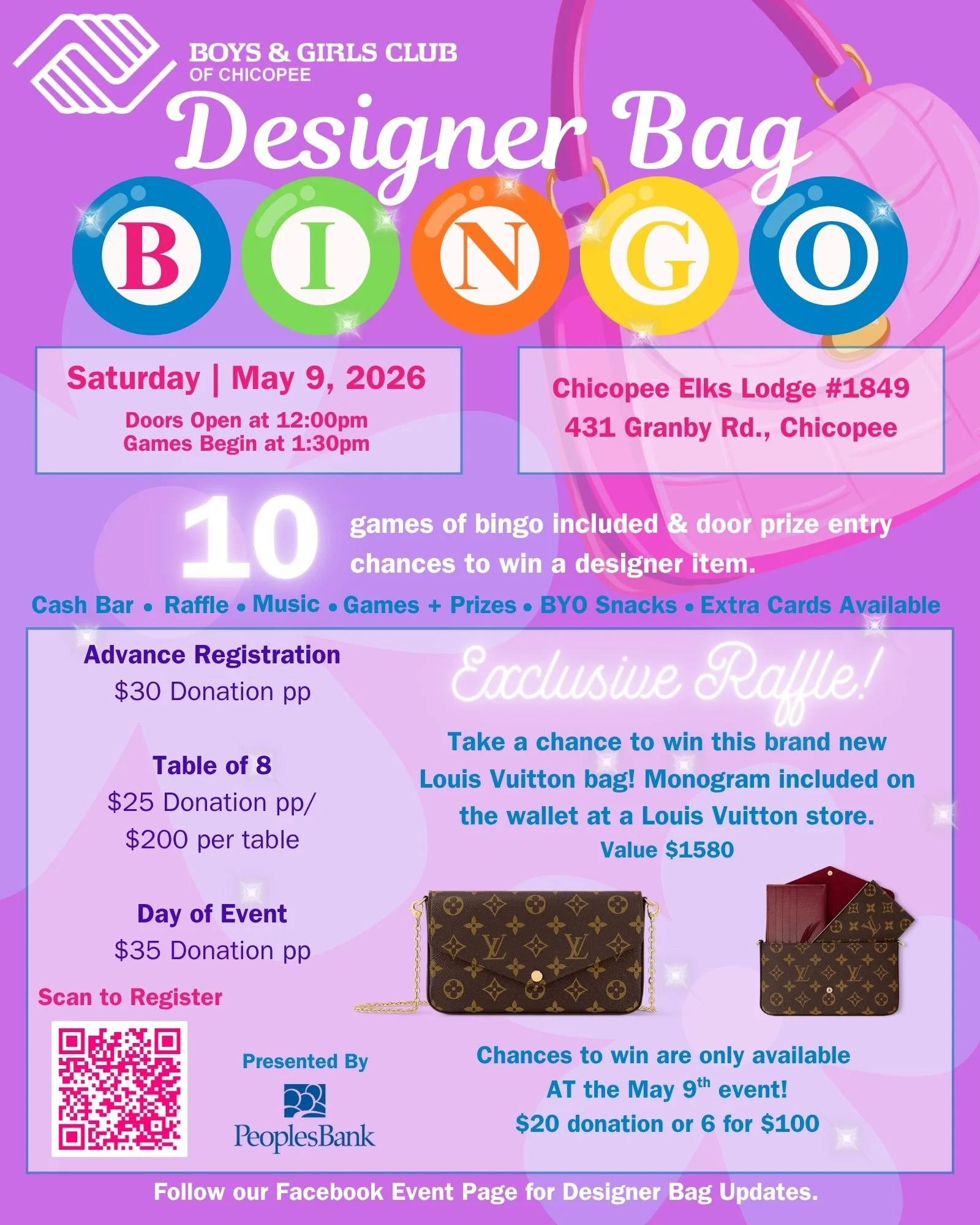 Join us for a fun-filled afternoon of Bingo with a twist! Enjoy 10 games of bingo and 10 chances to win a designer item from top brands like Coach, Michael Kors, Marc Jacobs, Kate Spade, Tory Burch, and more. This event also includes additional raffle prizes, a door prize, a cash bar, lunch available for purchase from 12-1:30pm hamburgers/hot dogs and a chance to relax with family and friends—all while supporting the Boys & Girls Club of Chicopee. New this year - your chance to win a Louis Vuitton day of the event only! It’s a great way to enjoy a fun time while contributing to a great cause!